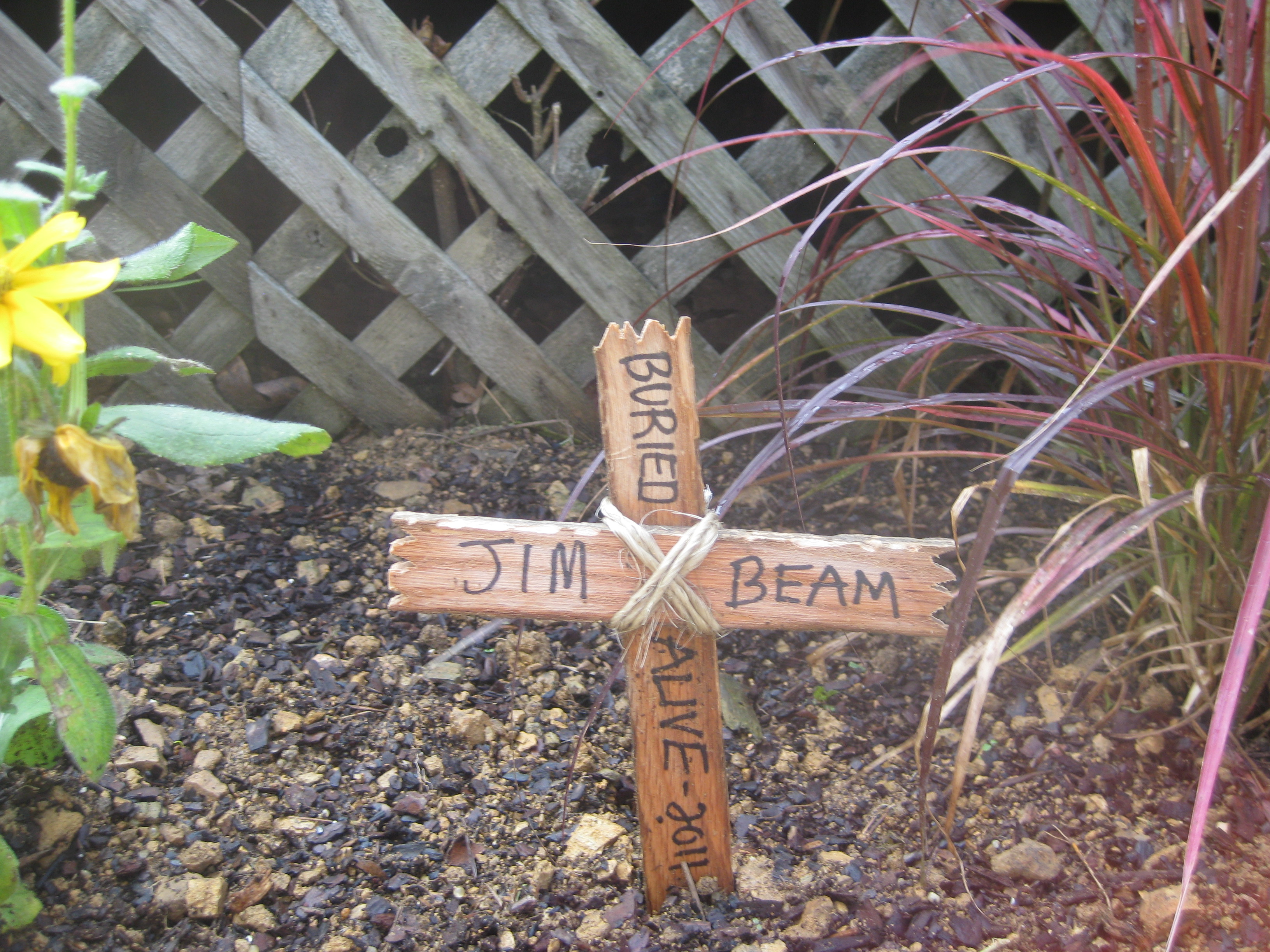 I arrived home the night after the burial and started watering plants in my new flower garden. Behold, there was a cross sorrowfully and lovingly placed in the soil that read: “Jim Beam, buried alive. 2011.” J.R. had had to give his respects to this unnatural death.